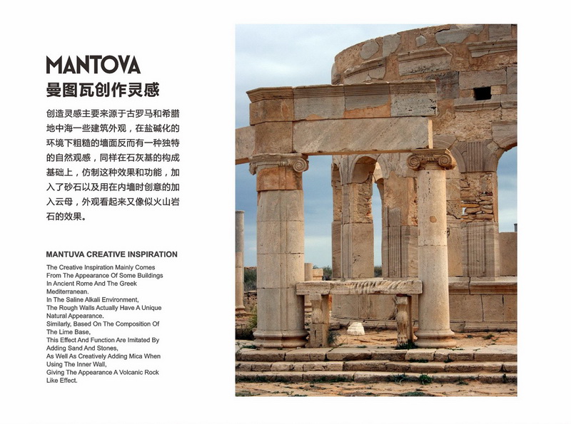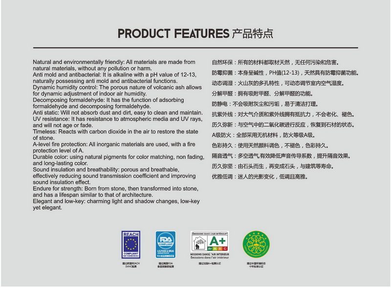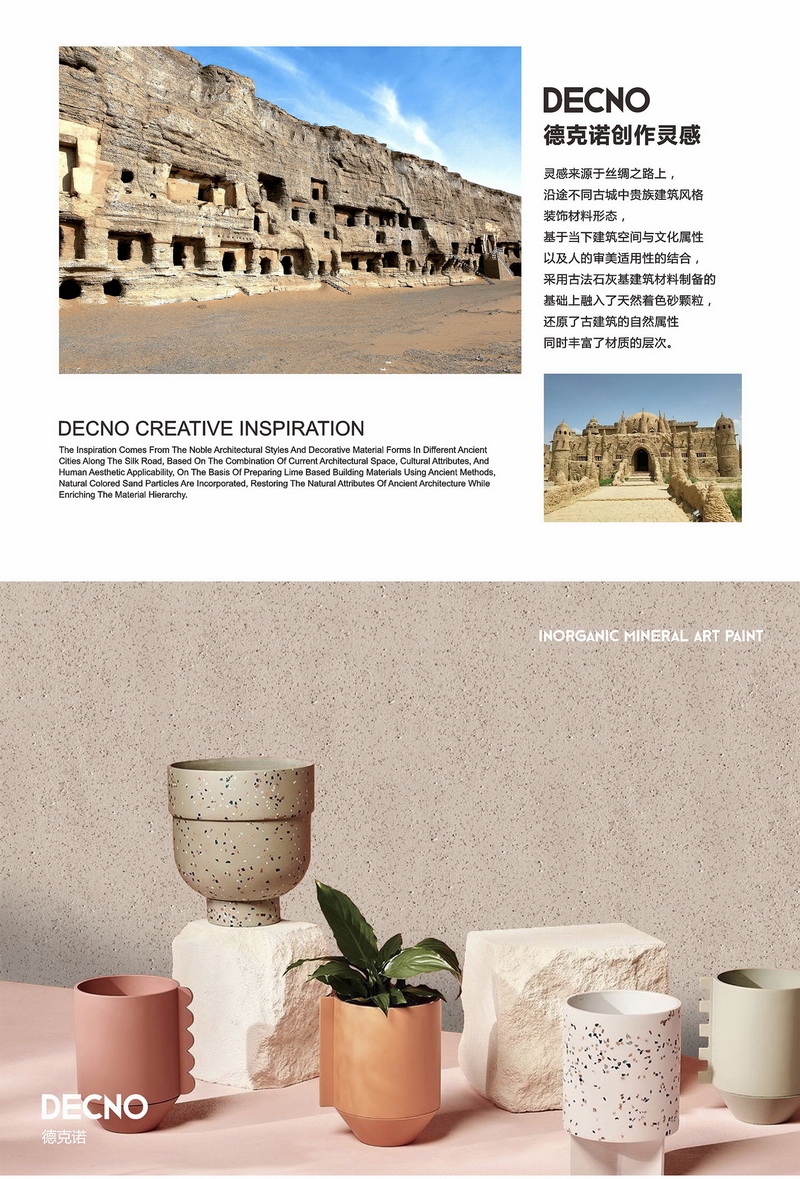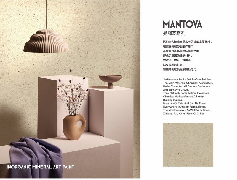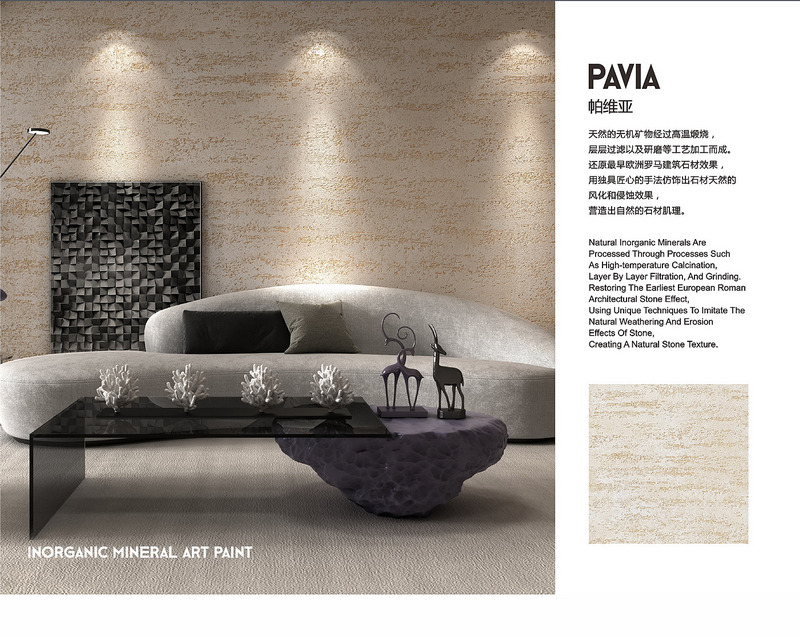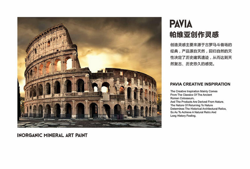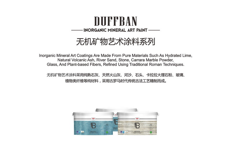 无机矿物艺术涂料采用纯熟石灰、天然火山灰、河沙、石头、卡拉拉大理石粉、玻璃植物类纤维等纯材料,采用古罗马时代传统古法工艺精制而成。